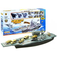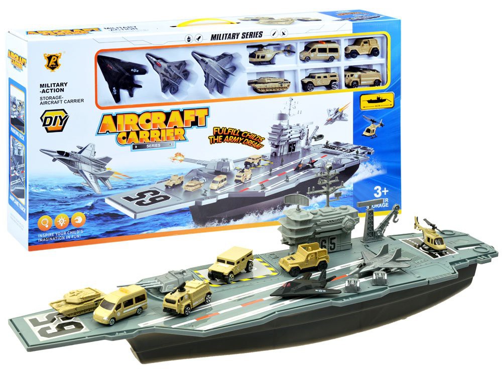 A készlet tartalma: - repülőgép-hordozó - 3 x vadászgép - helikopter - tartály - 4 katonai jármű - katonafigurák Repülőgép-hordozó méretei kb. 86 x 20cm x 18cm