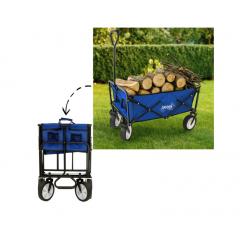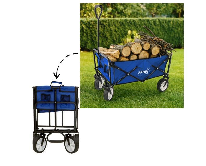 Ez a praktikus, összecsukható kék kerti kocsi tökéletes különféle terhek szállítására. Vízálló anyagának, fém vázának és kényelmes, széles fogantyújának köszönhetően könnyen összecsukható és tárolható.