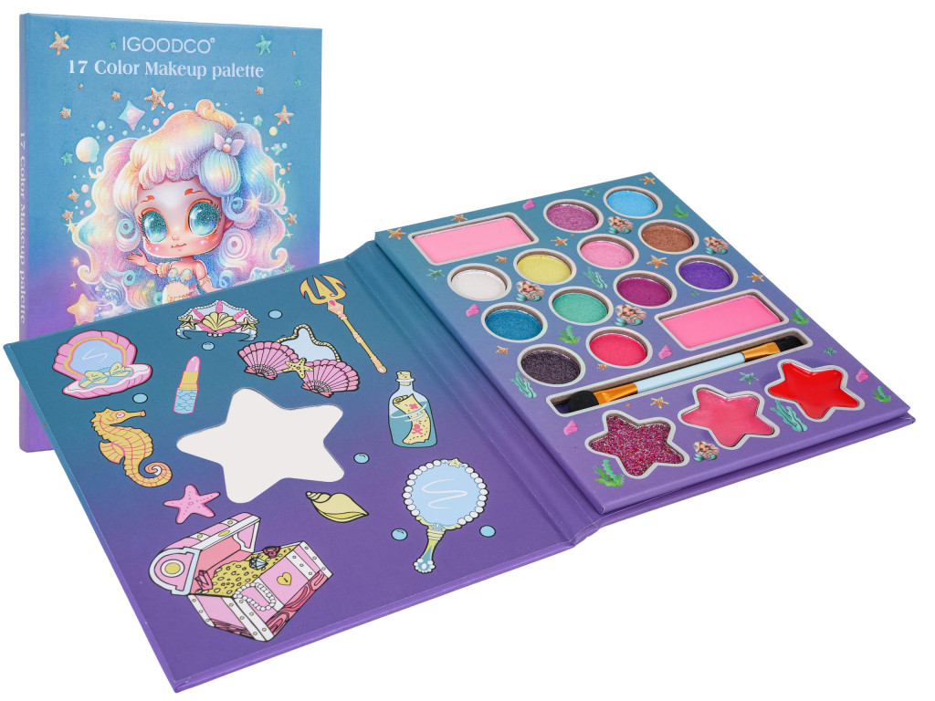 Kozmetikai paletta három év feletti gyermekek számára. A készlet tartalmaz egy sellő témájú palettát tükörrel, 17 kozmetikumot (szemhéjfesték és szájfény), valamint egy sminkecsetet. A kozmetikumok gyermekbiztos anyagokból készültek, hipoallergének és nagyon könnyen eltávolíthatók. Elegendő csak víz és babaszappan vagy fürdőhab.