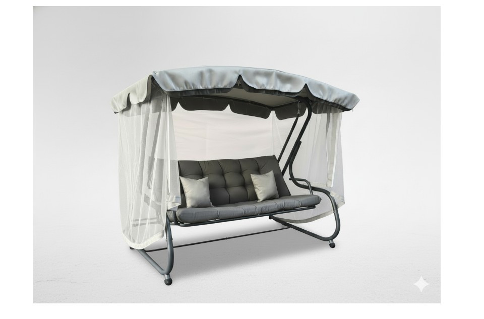 A masszív acélszerkezet , a kényelmes nyugágy , a 8 cm vastag steppelt párna és a funkcionális szúnyogháló teszi ezt a hintát a kikapcsolódás igazi menedékévé – még a nyár derekán és a szúnyogok rémálma alatt is!