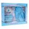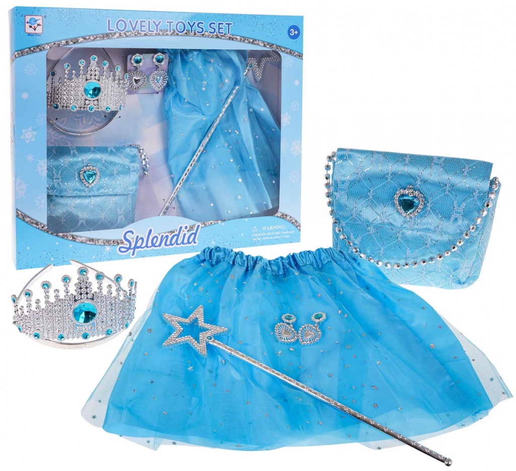 Kiváló szett, kis hercegnőnek való ruha 3 éves kortól. A készlet tartalmaz egy tiarát, egy varázspálcát, egy fülbevalót, egy kézitáskát és egy szoknyát. A szett a részletekre való odafigyeléssel készült, gyönyörű kék színben.