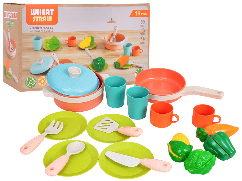 Környezetbarát edények és kiegészítők készlete hároméves kortól gyermekek számára. Bioműanyagból készült, 19 darabos készlet: edények és élelmiszer-utánzó anyagok. Az élénk színek vonzzák a gyerekek figyelmét és játékra ösztönzik őket.