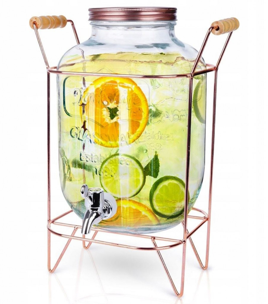 Limonádés üveg, italadagoló csappal,rose gold színű fém állvánnyal 5l-es