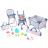 Étkezéskor a baba kényelmesen elfér az etetőszékben, amely egy tálat tartó tálcával van felszerelve. A készlet biztonságos evőeszközöket is tartalmaz: egy kanalat és egy villát. Természetesen van egy cumisüveg is a baba számára. A gondozási rutin kiegészítéseként egy bili is található – így a készlet igazán teljes.