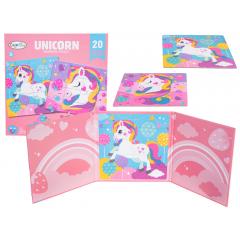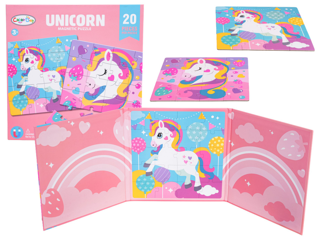 Színes könyv mágneses unikornisokat ábrázoló kirakókkal hároméves kortól. A könyv két mágneses és két nem mágneses oldalból áll, a mágneses oldalakon egy 20 darabos unikornis kép található. A nem mágneses oldalakon a kirakós darabok festett képe látható. A kirakós darabok biztonságosan tartanak és nem esnek le. Babakocsiban vagy autóban is összeszerelhetők. A készlet élénk színei ösztönzik a gyerekeket az összerakásra.