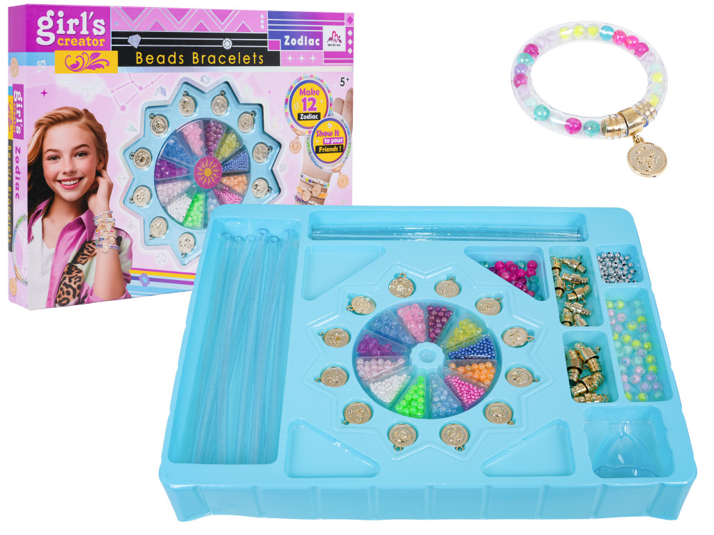 Kreatív karkötőkészítő készlet öt éves kortól. Ez a jól felszerelt készlet a legmagasabb minőségű, gyermekbiztos anyagokból készült. Nagyszerű eszköz a képzelet és a kreatív gondolkodás fejlesztéséhez. Gyermeked ékszerei egyediek és megismételhetetlenek lesznek. A készlet átlátszó karkötőkészítő csöveket, színes gyöngyöket és csillagjegy medálokat tartalmaz.