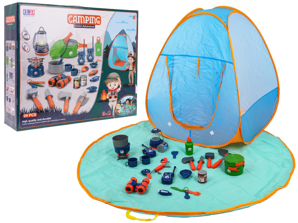 Tökéletes készlet beltéri és kültéri játékhoz. Az egész 29 elemből áll, köztük: sátor, kempingszőnyeg, kempingtűzhely, zseblámpa, kempinglámpa, távcső, walkie-talkie, szerszámok és edények.