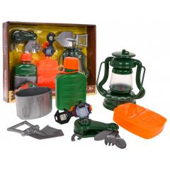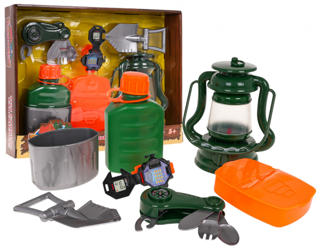Kempingkészlet 3 éves kortól gyermekek számára. A készlet tartalmaz egy lámpát, egy kulacsot, alapvető felszereléseket, egy órát, egy ételtárolót és egy lapátot. Ezzel a készlettel gyermeked igazi felfedezőnek érezheti magát. A lámpa 3 db AG13 elemmel működik (tartozék).