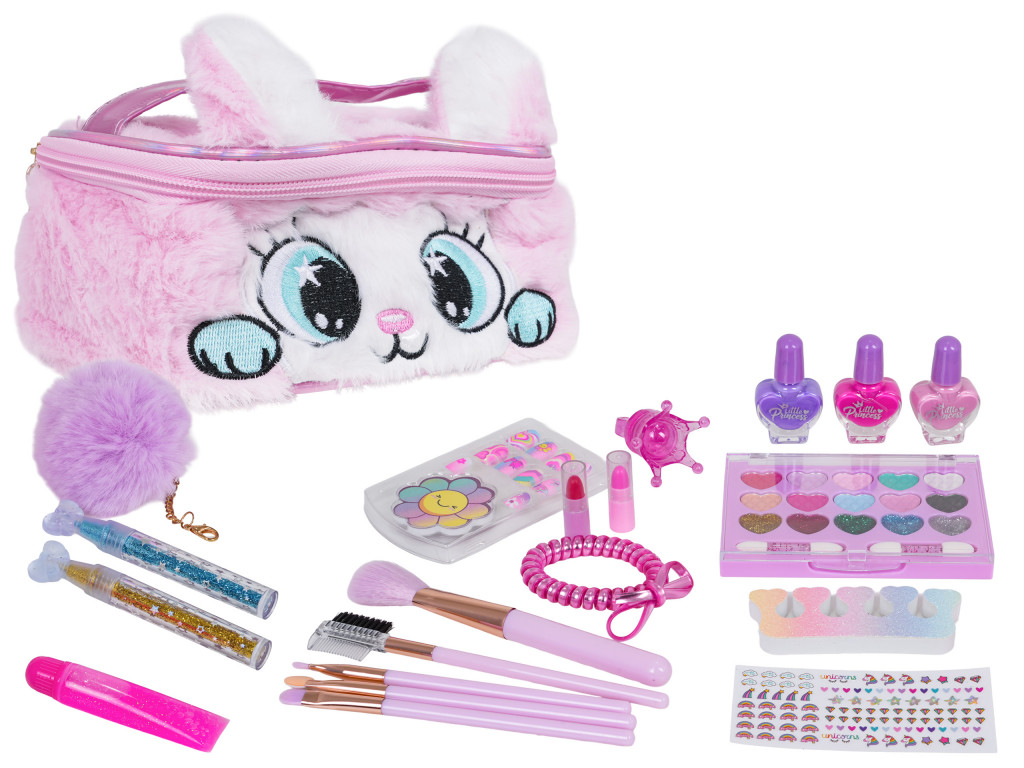 Egy kis stylistkészlet egy aranyos táskában hároméves kortól gyermekeknek. A plüss cicás táska olyan kincseket rejt, mint a körömlakkok, szemhéjfestékek, ecsetek, műköröm és még sok más. A készlet a legmagasabb minőségű, gyermekbiztos anyagokból készült. A kozmetikumok hipoallergének és könnyen eltávolíthatók; egyszerűen használjon szappant és vizet.