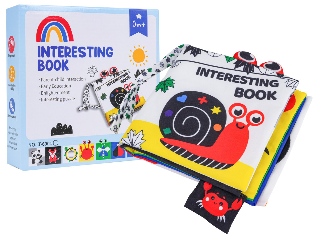 Szenzoros könyv babáknak az élet első napjaitól. Bababarát anyagokból készült, a könyv   tetejére két szalag és rákszem van varrva. Az első és az utolsó oldal gyűrött szabású, belül pedig egy tükör és egy sípoló is található. Ez a könyv segít fejleszteni a koncentrációs készségeket, a kéz-szem koordinációt, és támogatja a színek és formák tanulását.