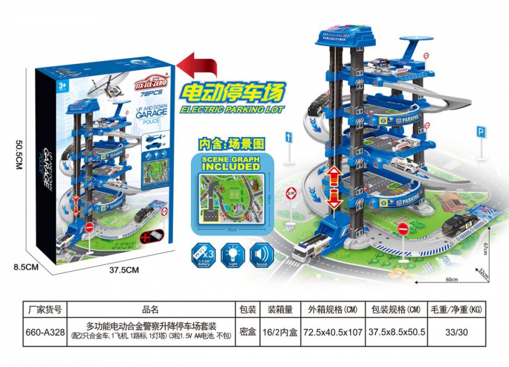 Nagy, többszintes rendőrautó parkoló 3 éves kortól ajánlott. A parkoló öt szintes, amely lifttel vagy csúszdával közelíthető meg.