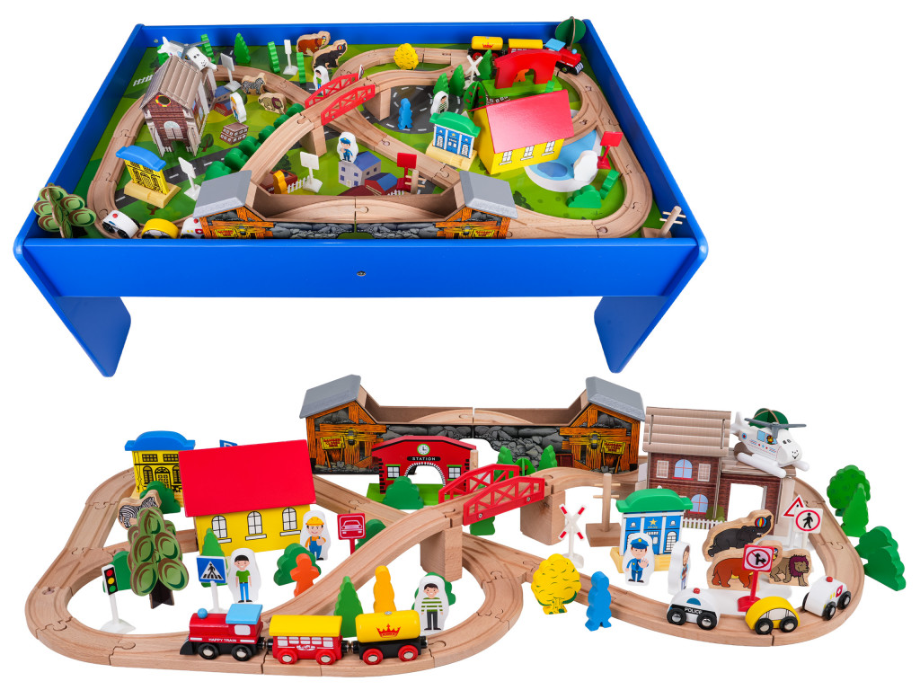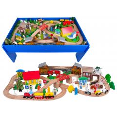 Egy fa vonatkészlet asztallal és rengeteg kiegészítővel, három éves kortól ajánlott. A készlet tartalmaz egy fa síneket vonattal és egy vasúti szettet, melyek egy masszív, tetején út mintával díszített faasztalon helyezkednek el. Az asztal szélei megemeltek, hogy a darabok ne essenek le.