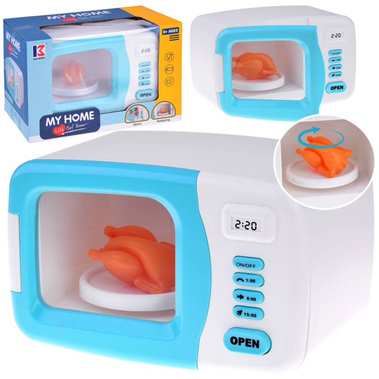 A mikrohullámú sütő minden kis háziasszony konyhájának elengedhetetlen kelléke. A gyerekek szívesen főznek különféle ételeket mackóiknak és babáiknak, így ez a mikrohullámú sütő minden kis szakácsnak biztosan örömet okoz. A mikrohullámú sütőben van egy be-/kikapcsoló kapcsoló, amelyet megnyomva aktiválja az ételmelegítő berendezést.