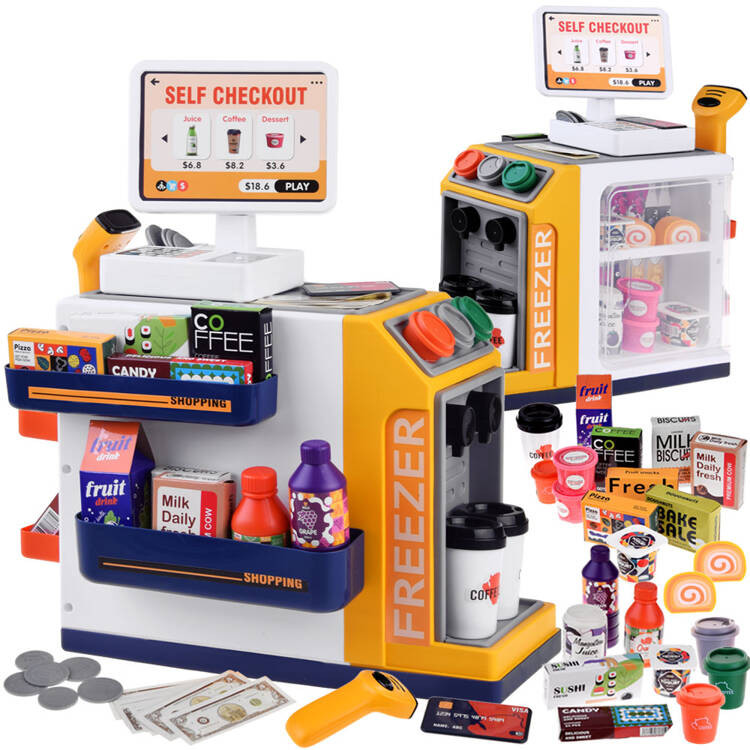 Ez az önkiszolgáló élelmiszerbolt kávéfőzővel és italhűtővel remek kelléke egy otthoni kis bevásárlóközpontnak. A gyorsszolgálati pont minden kisvállalkozó számára ajánlott, aki lépést tart az ügyfélszolgálat legújabb trendjeivel. A teljes üzletben kávéfőző, italok, desszertek tárolására szolgáló hűtőszekrény és olvasóval ellátott pénztárgép található. Remek ötlet eladót játszónak, italokat és harapnivalókat kínáló szervizhelynek.
