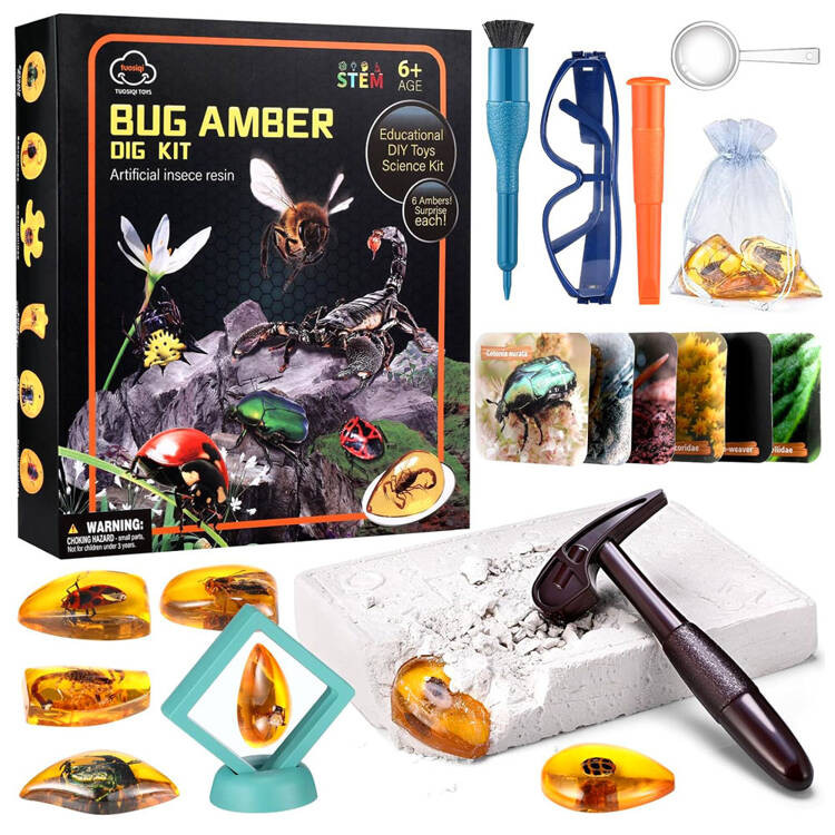 A gipszbevonatba hat borostyánszínű darab, beágyazott rovarokkal volt elrejtve. A mi feladatunk a mellékelt eszközök - kalapáccsal és vésővel - kiásni őket.  A talált borostyán dísztáskába vagy vitrinbe helyezhető, így minden gyerekszoba érdekes dísze lehet.