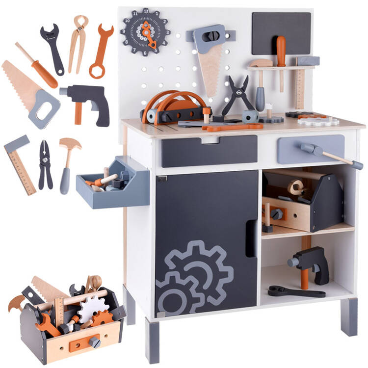 A készlet sok fa részből és közel 55 kiegészítőből áll, és minden olyan elemmel fel van szerelve, ami egy profi műhelyben szükséges. Itt megtalálod többek között a munkához szükséges eszközöket; csavarhúzó, kalapács, csavarok, fogaskerekek, anyák, mérőedények, fogók, fűrész, kulcsok stb., valamint egy tágas szerszámosládát is, egy fekete krétatáblát és egy mozgatható mutatós órát.