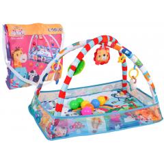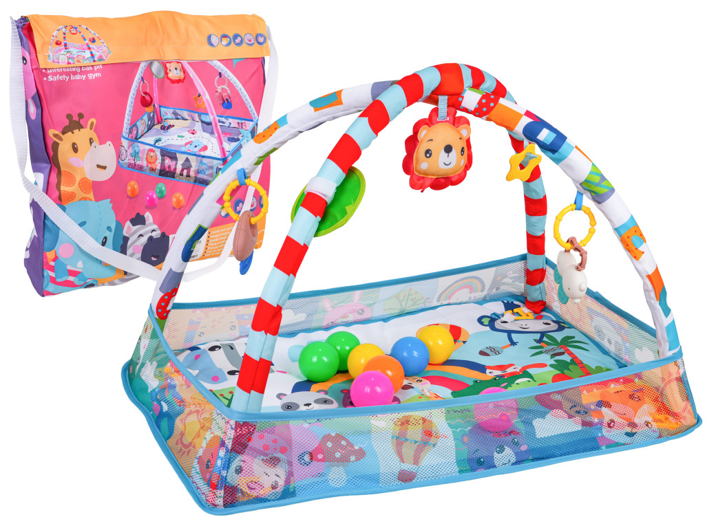 Oktató jellegű játszószőnyeg, száraz medence, gyermekek számára születéstől kezdve. A szőnyeg bababarát anyagokból készült, élénk, szemet gyönyörködtető színekben. Az anyag könnyen tisztítható, a szerkezet masszív és stabil. A játékrúd levehető akasztókkal rendelkezik, amelyek kiságyra vagy autósülésre is rögzíthetők. A készlet több labdát is tartalmaz. A teljes készlet egy zacskó alakú, pántos csomagolásban található.
