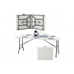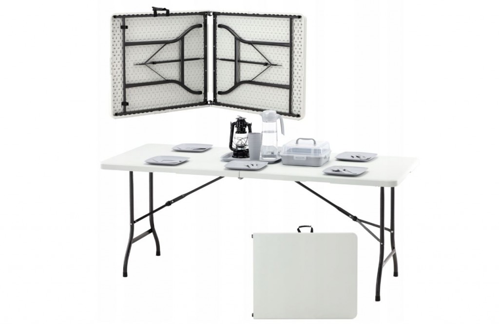 Kiváló minőségű anyagokból (fém + polietilén) készült összecsukható turistaasztal , mely rendkívül tartós és minden időjárási körülménynek ellenáll. Az asztal összecsukása után egy szállításra alkalmas bőröndöt kapunk.