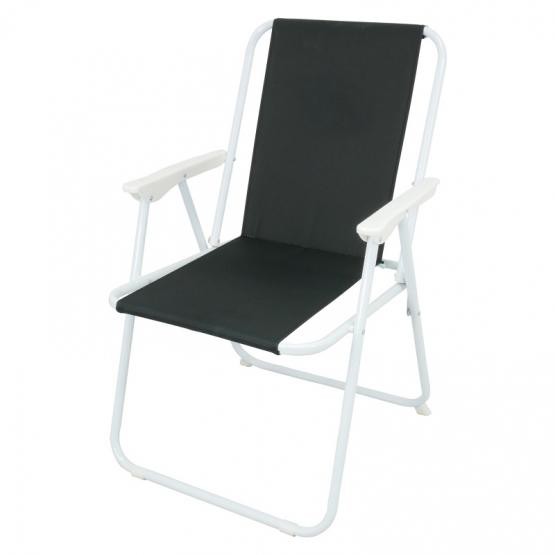 Kényelmes kemping szék, amely kiválóan alkalmas erkélyre, teraszra, telkre, strandra és kertbe. A fekete modell háttámlája poliészterből készült. A tömör szerkezet 18 mm-es profilú acélcsövekből készült kereten alapul.