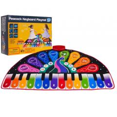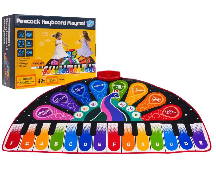 Nagyméretű, billentyűzet formájú zenei szőnyeg 3 éves kortól a mozgást, zenét és a jó szórakozást kedvelő gyermekek számára. A szőnyeg játékon keresztül fejleszti a zenei képességeket, a szem-kéz koordinációt és az érzékszervi képességeket. Színek segítségével vezeti be a gyermeket a zene varázslatos világába. A szőnyeg alján egy érintőbillentyűzet található 24 színes billentyűvel. Fent egy színes páva, mind a nyolc tollan egy-egy gomb más-más hangszerrel: zongora, vibrafon, oboa, trombita, szaxofon, bendzsó, hegedű és gitár.