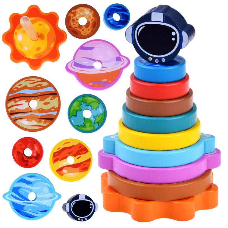 A kisgyermek feladata a korongok elrendezése az alapon – a legnagyobbtól a legkisebbig. A piramis vége egy űrhajós sisak alakú elem. Az egész kozmikus stílusban van megalkotva, a korongok a Naprendszer bolygói, az alap pedig a Nap.