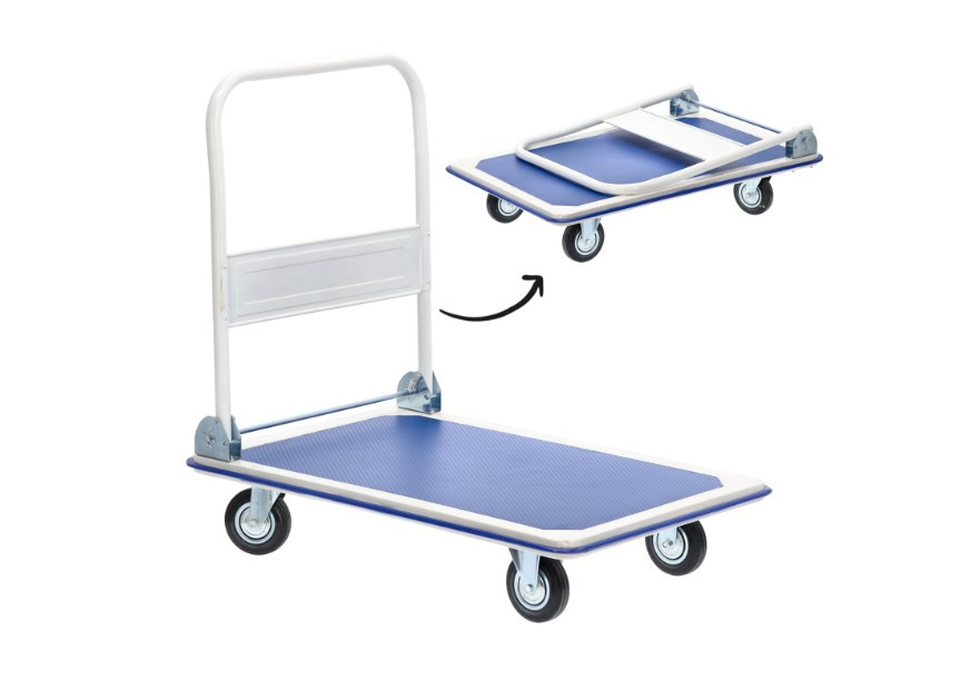 Porszórt acélból készült, masszív platformkocsi, könnyű és nehéz, akár 300 kg-os terhek szállítására tervezve. Forgó kerekekkel és egyszerű összecsukható mechanizmussal felszerelt a könnyű tárolás érdekében.