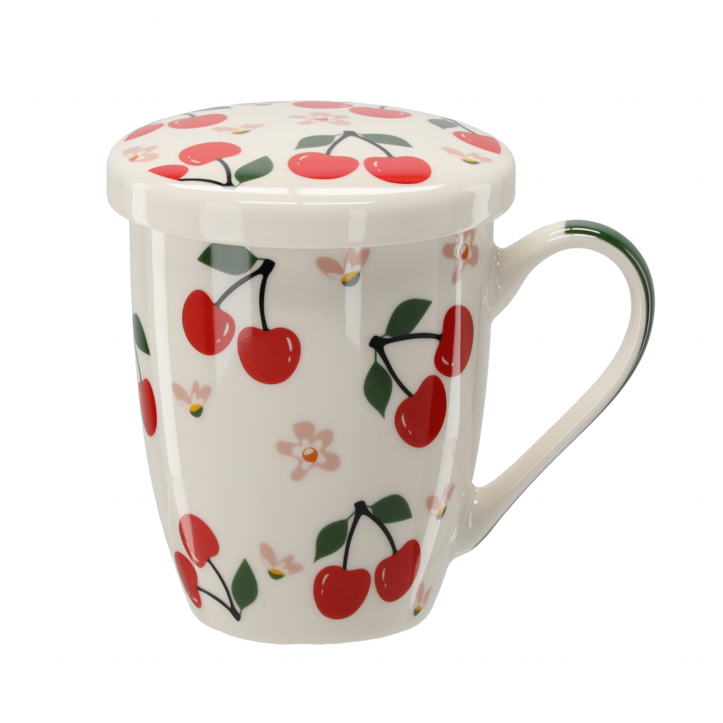 Porcelán bögre fedővel és szűrővel cseresznye mintás, díszdobozban