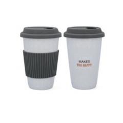 Porcelán utazó kávés pohár, szilikonos fogórésszel- 390ml -szürke/fehér