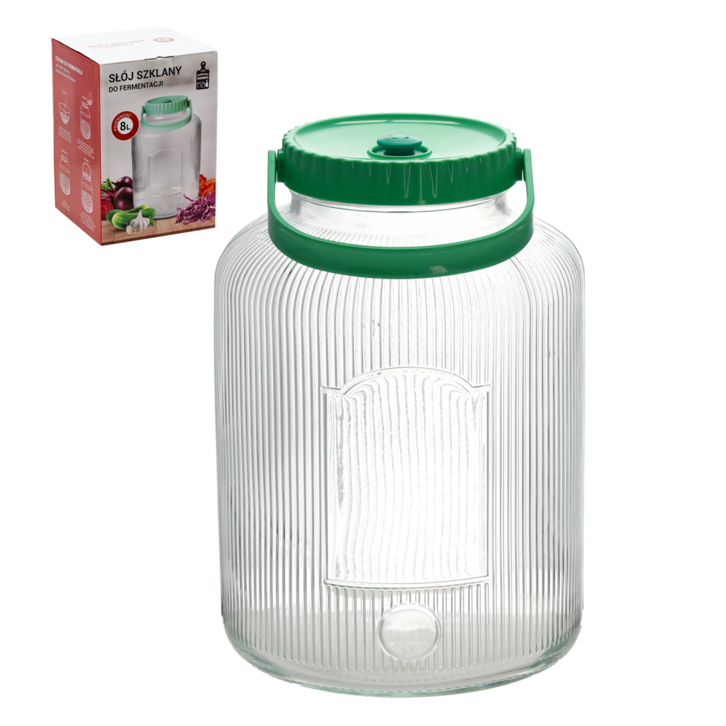 Ez a 8 literes üveg savanyúság- és erjesztőedény tökéletes megoldás házi készítésű lekvárok, például savanyúságok, uborka vagy káposzta elkészítéséhez. A kiváló minőségű üvegből készült üveg tartósságot és higiénikus tárolást biztosít. A zöld, fogantyús fedél megkönnyíti a zárást, a speciális kialakítás pedig kényelmes tárolást biztosít. Kiváló választás erjesztéshez, mind a konyhában, mind a pincében.