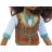 A Pru babának göndör barna haja, barna szeme van, kék pólót mellénnyel, kék nadrágot, barna magas csizmát és tágas táskát visel.