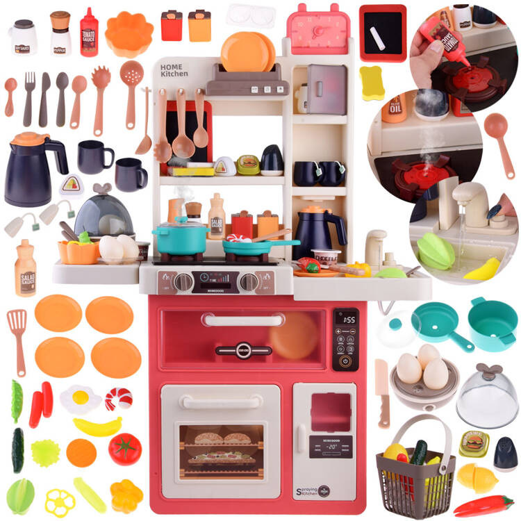 A 63 részes konyhakészlet tökéletes szabadon álló konyha felszereléssel egy kis szakács vagy háziasszony számára. A konyha teljes egészében műanyagból készült, vonzó krém-rózsaszín színben. Előnyei közé tartozik a sütőpanel, amely főzési, fény- és gőzhanghatásokat produkál. A konyhában is nagyon szükséges egy mosogató csappal és az étkezés utáni mosogatáshoz. Mindent pedig egy három háttérvilágítású gombos panel felügyel, amely a hangeffektusokért, a vidám, nyugodt dallamokért és a páraelszívó működéséért felel. A konyhában sok polc, kampó, mosogatógép, sütő, hűtőszekrény és munkalap található.