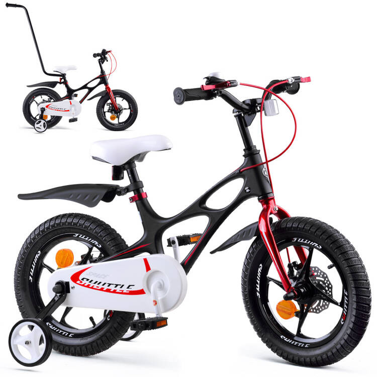 A neves cég 14"-os Royal Baby Space Shuttle kerékpárja az első kiváló minőségű kerékpár a kétkerék szerelmeseinek, tökéletes egy igazi háztáji lovasnak. Magnézium, könnyű váz ívelt felülettel és sima vonalakkal, valamint professzionálisan állítható profilozott kormány biztonságos gumi markolattal és zárt borítással. Kényelmes nyereg, 14 colos kerekek, dupla tárcsafékekkel, kényelmes és stabil vezetést biztosít sérülések és szennyeződések ellen. A jó minőségű alkatrészek jól megőrződnek, ami biztosítja, hogy a színeket és a grafikát a tulajdonos és a barátok értékeljék. A kormány, a nyereg és a pedálok közötti távolság sima és kényelmes.