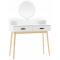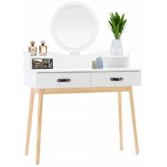 Egy funkcionális, minimalista, skandináv stílusú fésülködőasztal remek kiegészítője lehet egy lányszobának. A fehér fésülködőasztal kerek tükörrel, tágas fiókokkal és kényelmes székkel tökéletes lesz a sminkeléshez, a frizura elkészítéséhez, az öltözékek formázásához és még naplóíráshoz is.