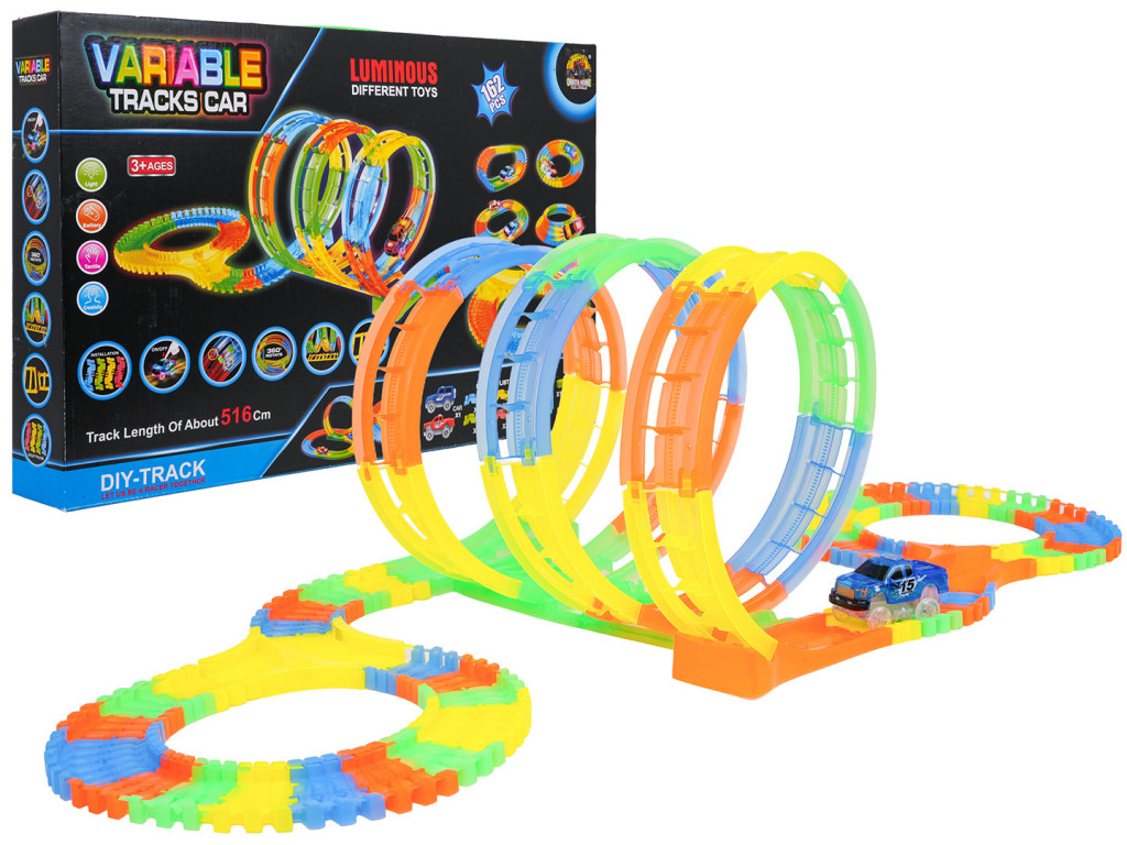 Ez a sötétben világító, hurkokkal és autóval ellátott versenypálya tökéletes három éves kortól a gyerekek számára. A pályák rugalmasak és bármilyen kombinációban elrendezhetők, forgathatók, emelhetők és áthelyezhetők menet közben. Ezenkívül a pályák fluoreszkálóak, azaz világítanak a sötétben. A mellékelt jármű LED-világítással rendelkezik, ami lenyűgöző hatást kelt sötétben vezetés közben. A járművet 2 db AA 1,5 V-os elem működteti (nem tartozék). Az autó indításához egyszerűen nyomja meg a tetején található gombot.
