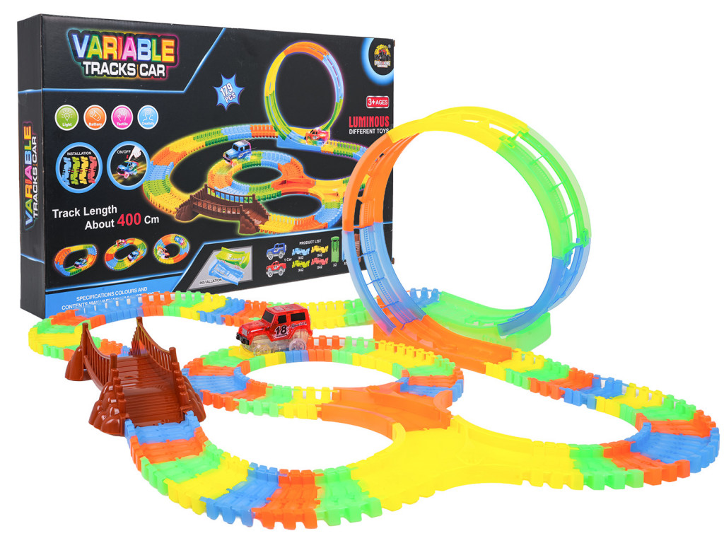 Ez a sötétben világító versenypálya 360 fokos körrel és a hozzá tartozó kisautóval tökéletes három éves vagy annál idősebb gyermekek számára. A pályák rugalmasak, és bármilyen kombinációban elrendezhetők, forgathatók, emelhetők és áthelyezhetők menet közben. Ezenkívül a pályák fluoreszkálóak, azaz világítanak a sötétben. A mellékelt jármű LED-világítással rendelkezik, ami lenyűgöző hatást kelt sötétben vezetés közben. A járművet 2 db AA 1,5 V-os elem táplálja (nem tartozék). Az autó indításához egyszerűen nyomja meg a tetőn található gombot.