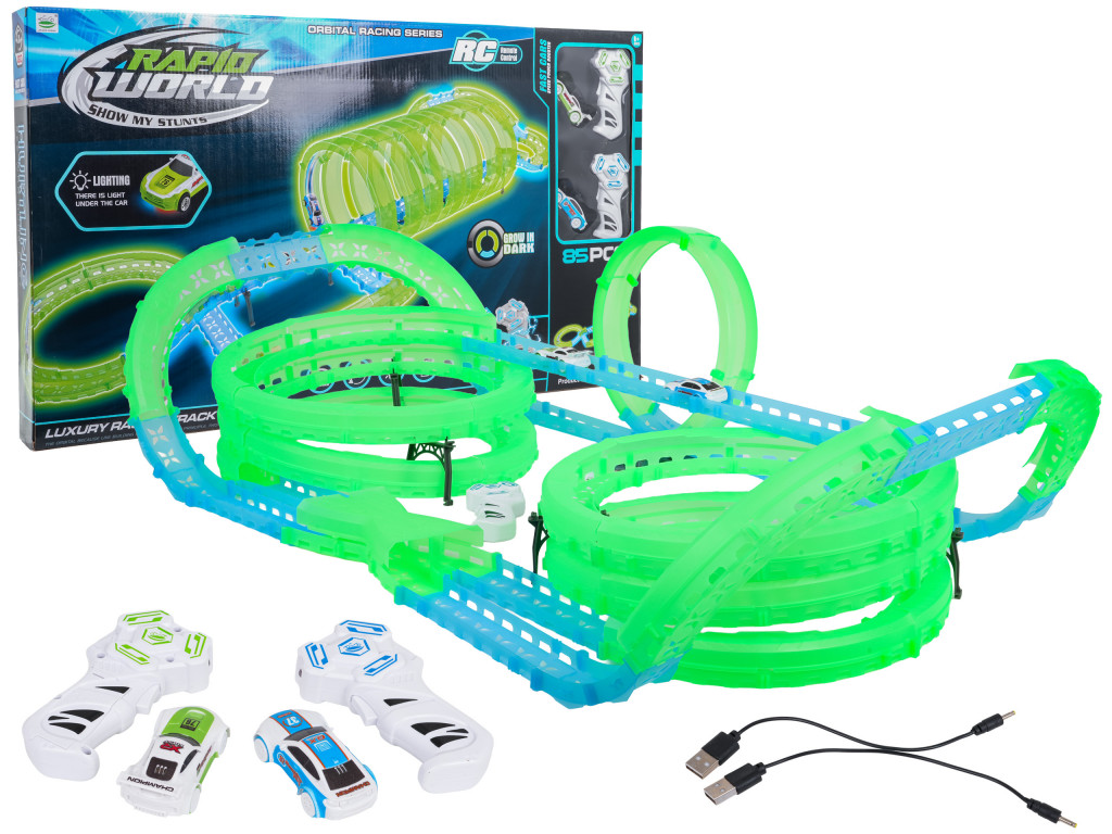 Ez a nagyméretű, sötétben világító versenypálya tökéletes hat éves vagy annál idősebb gyermekek számára. A készlet két távirányítót, két autót és pályaépítő alkatrészeket tartalmaz. A távirányítókat 2 db AAA elem (nem tartozék), míg az autókat 3,7 V-os elemek (tartozék) működtetik. A pálya fluoreszkáló és sötétben világít. Az autók LED-világítással rendelkeznek, amely lenyűgöző hatásokat kelt vezetés közben. A pályán való játék fejleszti a szem-kéz koordinációt, míg a pálya építése serkenti a gyermek képzelőerejét és fejleszti a kézügyességet.