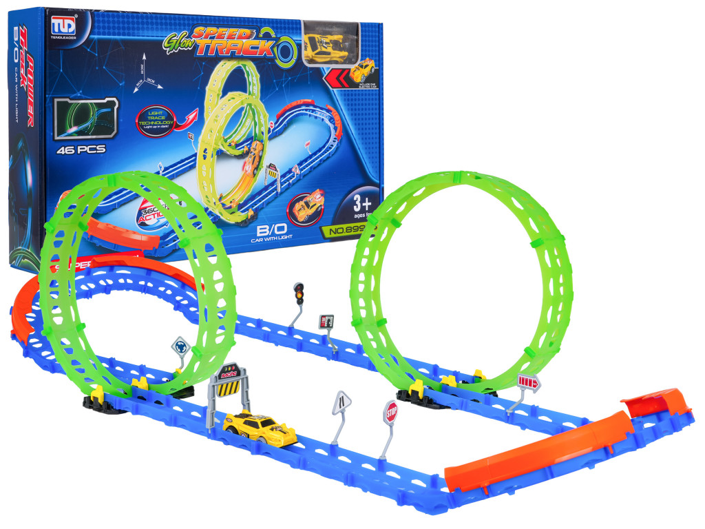 Ez a fluoreszkáló versenypálya éles kanyarokkal, hurkokkal és egy gyors autóval tökéletes hároméves vagy annál idősebb gyermekek számára. A készlet 46 önállóan összeszerelhető elemből áll. A pálya egyenes szakaszokat, éles kanyarokat és biztonsági korlátokat tartalmaz, amelyek megakadályozzák az autó kisiklását, valamint két 360 fokos hurkot. A hurkok fluoreszkálóak és sötétben világítanak. Az autó hátsó lámpákkal is rendelkezik. Az autót 2 db 1,5 V-os AAA elem működteti (az elemek nem tartozékok).