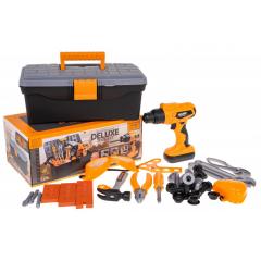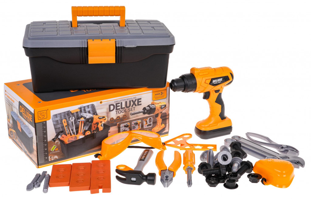 Jól felszerelt szerszámkészlet interaktív fúróval/csavarozóval és szerszámosládával 3 év feletti gyermekek számára. A készlet a legjobb minőségű műanyagból készült, és 37 elemet tartalmaz. A nagyméretű, professzionális megjelenésű szerszámosládán kívül a készlet tartalmaz még: interaktív fúrót/csavarozót cserélhető bitekkel, védőszemüveget, maszkot, csavarhúzót, kalapácsot, csavarkulcsot, fogót és sok csavart.