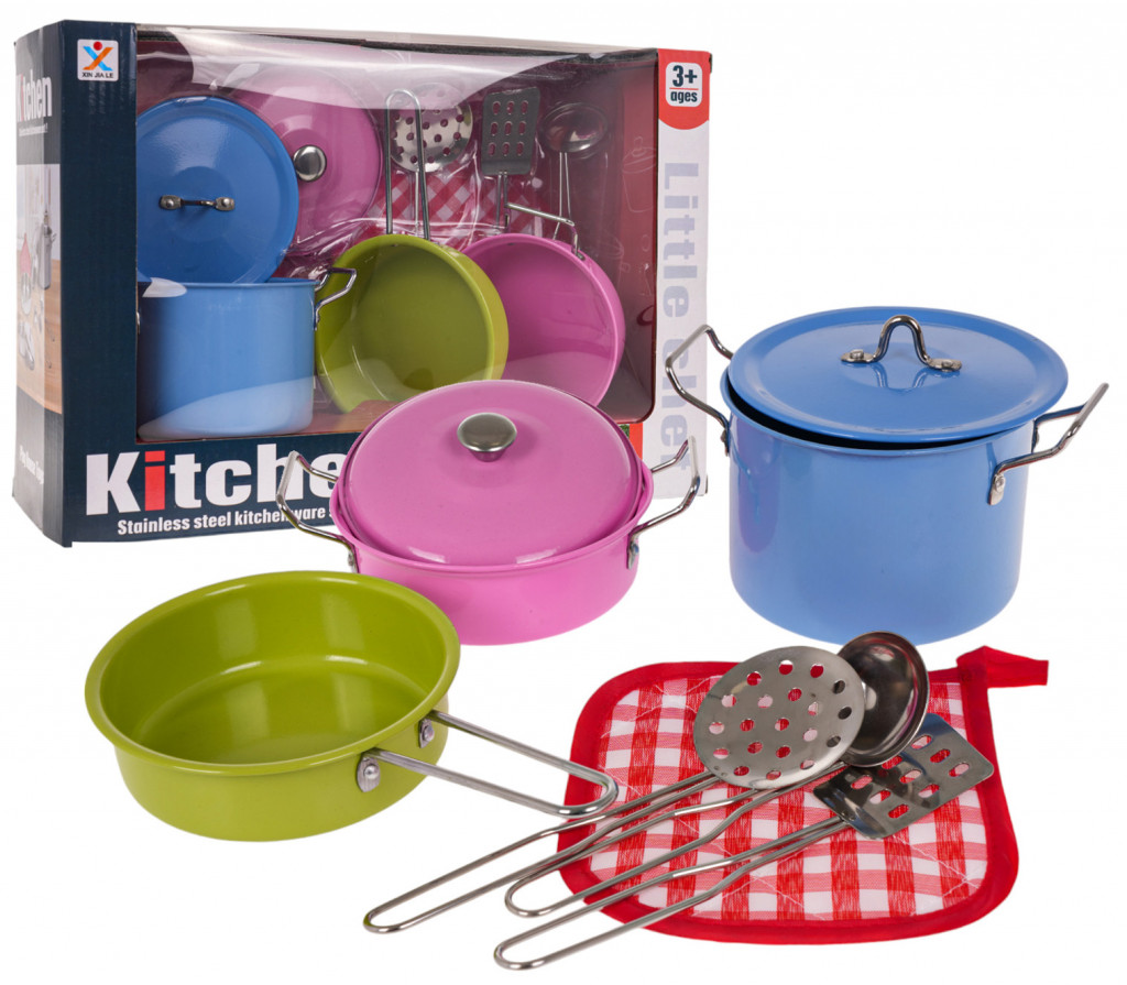 Színes fém edénykészlet 3 éves kortól gyermekeknek. A készlet tartalmaz egy gyönyörű kék ​​edényt füllel és fedővel, egy rózsaszín edényt füllel és fedővel, egy zöld serpenyőt, egy spatulát, egy szűrőkanalat, egy merőkanalat és egy konyhai szőnyeget. Minden nagyszerűen néz ki. A fém megbízhatóvá és tartóssá teszi a készletet.