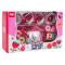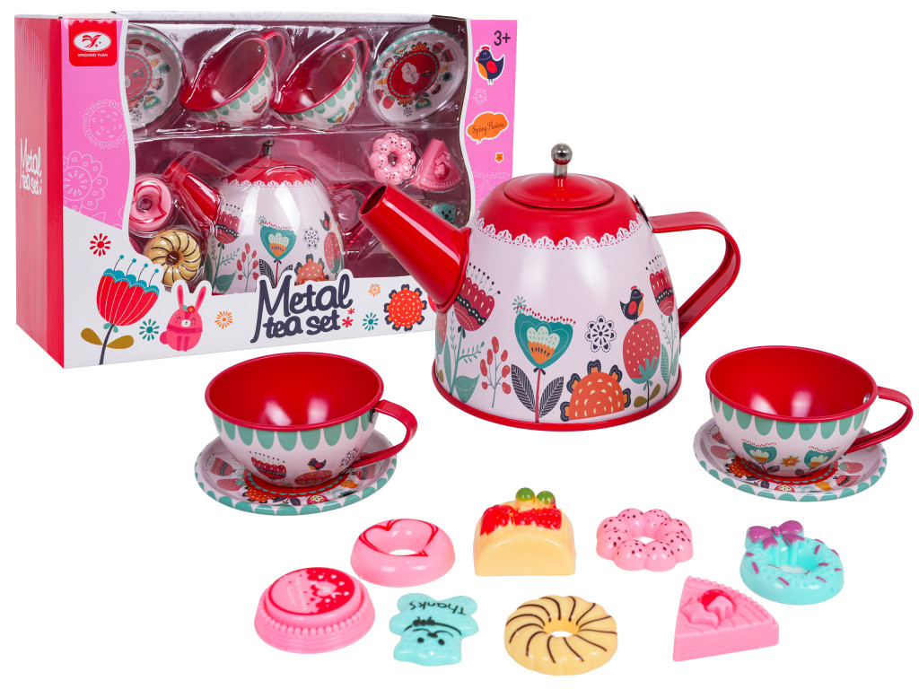Színes fém teáskészlet három év feletti gyermekek számára. A 14 darabos készlet mindent tartalmaz, amire a kicsinek szüksége van a tea és a sütemények felszolgálásához. A készlet tartalmaz egy teáskannát, csészéket, csészealjakat és cukorka-utánzatokat. A készlet elemei fémből készültek, és biztonságos, nem mérgező, élénk színű festékkel vannak bevonva.