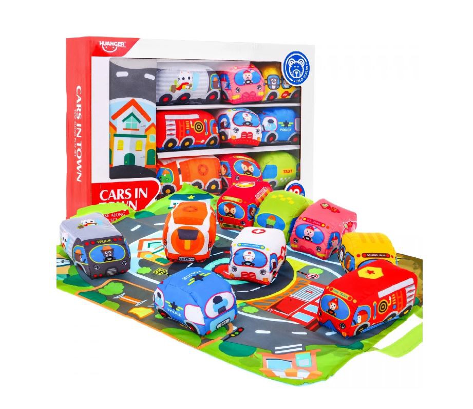 A készlet 12 hónapos kortól babák számára készült. Biztosan tetszeni fog minden kis autórajongónak. 9 színes, kellemes tapintású és biztonságos autóból és egy színes, puha szőnyegből áll, utcákkal és épületekkel. Három autó suhog, ha megérintik, három csörög, három nyikorog. A játék fejleszti gyermeke kreativitását és fantáziáját. A szőnyeg másik oldalán tépőzárak találhatók, amelyeknek köszönhetően táskaként használható autók tárolására és szállítására. A szőnyeg és az autók mosógépben moshatóak alacsony hőmérsékleten, könnyen tisztán tartható.