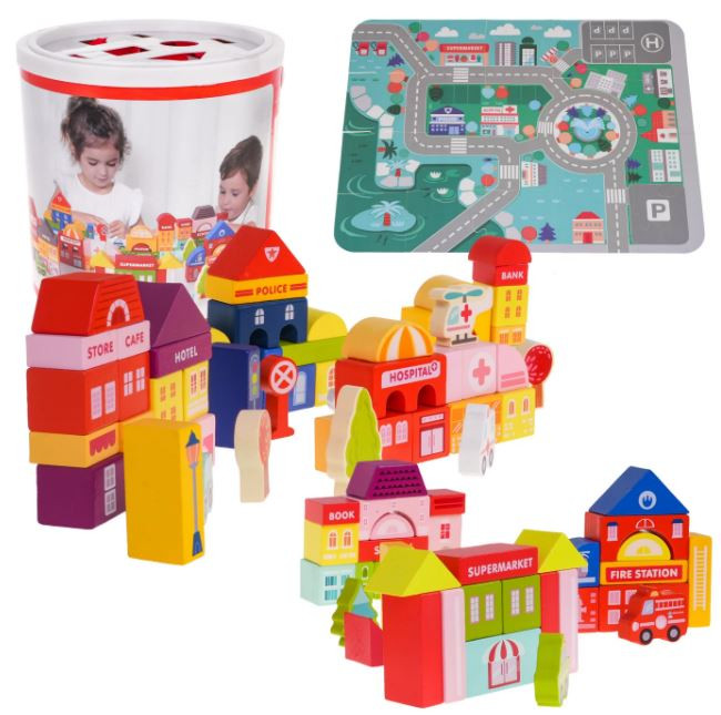 Gyerekeknek 3 éves kortól ajánljuk a festett fa, biztonságos blokk készletet, amelyből várost építhet. A készlet tömbökből, a blokkoknak való zacskóból és egy dobozból áll, tetején formaválogatóval. Tökéletes formák, geometriai figurák és szórakozás, amely serkenti a képzeletet és a logikus gondolkodást.