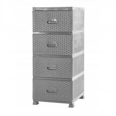 Szürke rattan hatású fiókos szekrény. 4 fiókot tartalmaz. Használata könnyü. Praktikus, minden tárgy elfér benne, igy sok helyet megtudunk spórolni a szobánkból. Tökéletesen lehet használni konyhába, fürdőszobába vagy folyosóra is. Rendkivül tágas és stabil lábakon áll. Divatos rattan mintával rendelkezik. Könnyen összeszerelhető, a pontos összeszerelési útmutató a termékhez csatolva megtalálható.