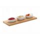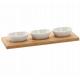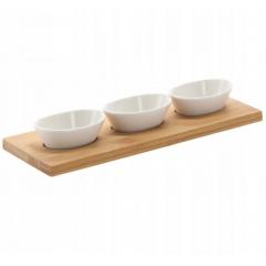 Ha szeretnéd meglepni vendégeit egyedi harapnivalókkal, ez a készlet neked szól. A készlet három, egyenként 90 ml-es porcelán tálból és egy bambusz deszkából áll, hornyos helyekkel a tálak számára. A deszka stabilitást és könnyű hordozhatóságot biztosít a készletnek, emellett eleganciát és természetességet ad hozzá.
