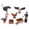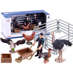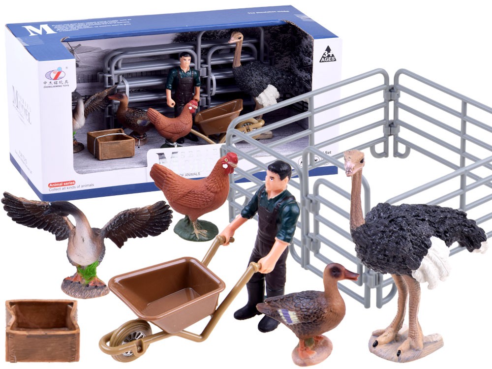 A készlet egy struccot, egy csirkét, egy libát, egy kacsát és a gazdát tartalmazza.
