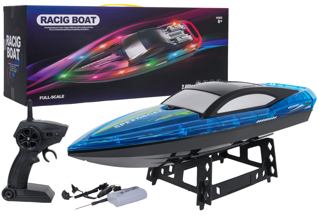 Távirányítású, gyors versenyhajó világítással nyolc éves kortól gyermekek számára. A hajó a legkiválóbb minőségű, tartós anyagokból készült. Az anyagok minősége és az áramvonalas kialakítás lehetővé teszi a gyors mozgást a vízben. A LED-es világítás jobban láthatóvá teszi a hajót, és remekül néz ki, különösen sötétedés után. A motorcsónak előre és hátra mozog, valamint balra és jobbra fordul. A játék egy érzékelővel van felszerelve, amely csak vízben aktiválódik. A távirányító 7,4 V-os 12000 mAh-s akkumulátorral (tartozék) működik, a távirányító 2 db AA 1,5 V-os elemmel működik (nem tartozék). A készlet tartalmaz egy állványt a hajóhoz.