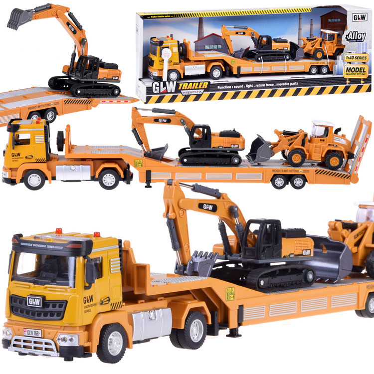 Tréler kotrógéppel és markolval – Egy kis építő álma! Ez a készlet tökéletes ajándék minden gyermek számára, aki szeret építőgépekkel játszani. Az autók a jármű indulásának hangjával, a tolatás hangjával, kürttel és olyan fényeffektusokkal van felszerelve, mint az elöl izzó lámpák és az autó tetején villogó lámpák. És mindez akkor történik, amikor megnyomja a járművet!