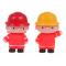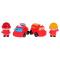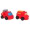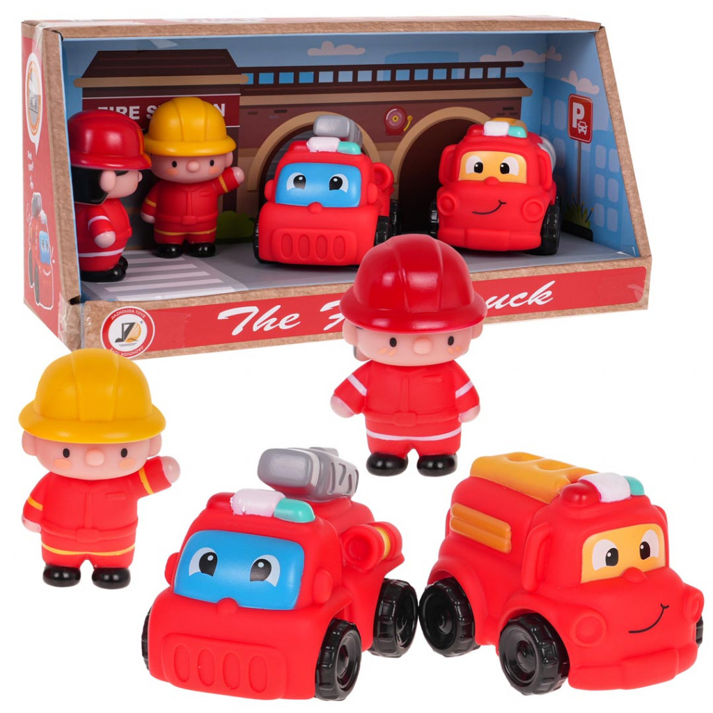 Színes készlet tűzoltó figurákkal és tűzoltójárművekkel 3 év feletti gyermekek számára. A készlet két tűzoltó figurát és két tűzoltóautót tartalmaz. Az autók és figurák gumiból, míg a járművek kerekei műanyagból készültek.