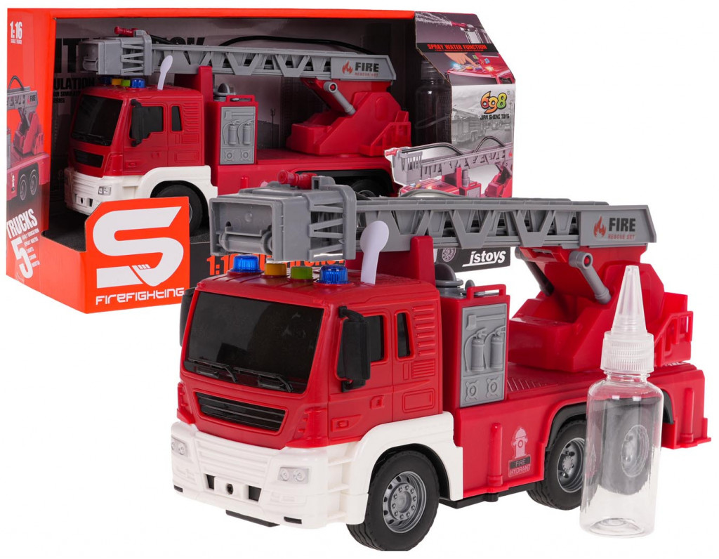 Interaktív tűzoltóság, 1:16 méretarányban, vízfunkcióval, 3 éves kortól gyermekek számára. Az állomás a legjobb minőségű műanyagból készült, élénk színekben. Gumikerekekkel rendelkezik, amelyek jól tapadnak a talajhoz, és súrlódós meghajtással. A tűzoltóautó tetején gombok találhatók, amelyek a sziréna hangját, a jármű indítási hangját és a motor működésének hangját adják. A hanggombok oldalán világító fények is találhatók. A tűzoltóautó létrája emelhető és süllyeszthető, valamint előre mozgatható (manuálisan). Miután a jármű kabinja mellett található tartályt vízzel feltöltöttük és megnyomtuk a pumpát, víz fog folyni a tömlőből. A játék 3 x AG13 elemmel működik (tartozék).