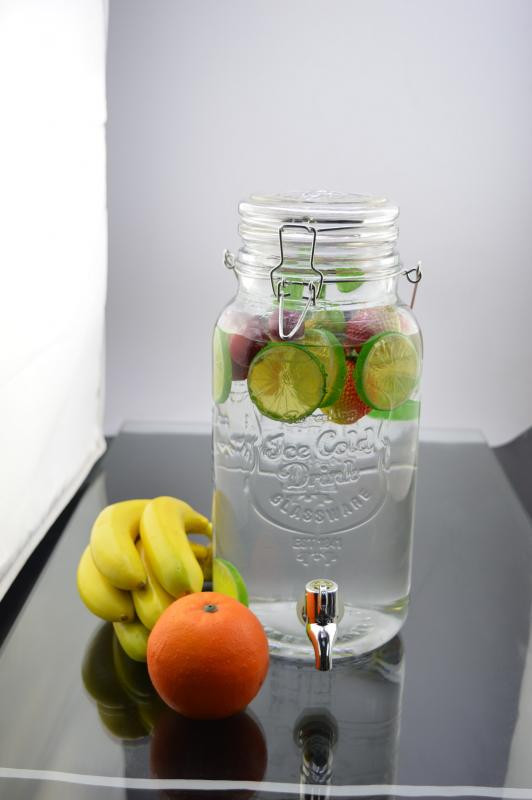 Vastag üvegedény dombornyomott részletekkel. Üvegtetővel, mechanikus zárral és csappal rendelkezik az ital adagolásához. Masszív és stabil, kiváló minőségű üvegből készült. Használható önkiszolgáló rendezvényeken, kávézóban vagy étteremben, vagy akár adagolóként a saját konyhában.
